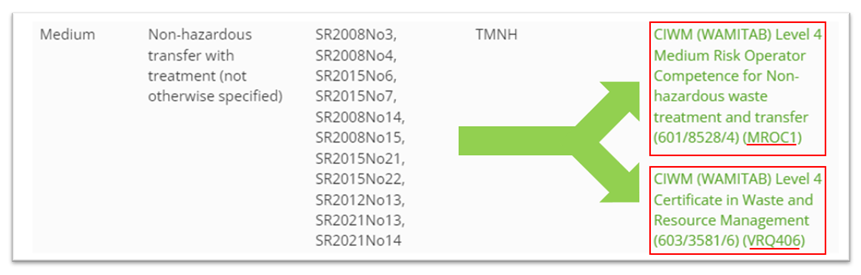 We have provided below an example taken from the CIWM (WAMITAB) risk tier table for non-hazardous waste transfer and treatment, where you will clearly see the first qualification listed is the ‘’CIWM (WAMITAB) Level 4 Operator Competence for Non-hazardous waste treatment and transfer’’ more commonly known as ‘’MROC1’’ achieved through assessment in the working environment.